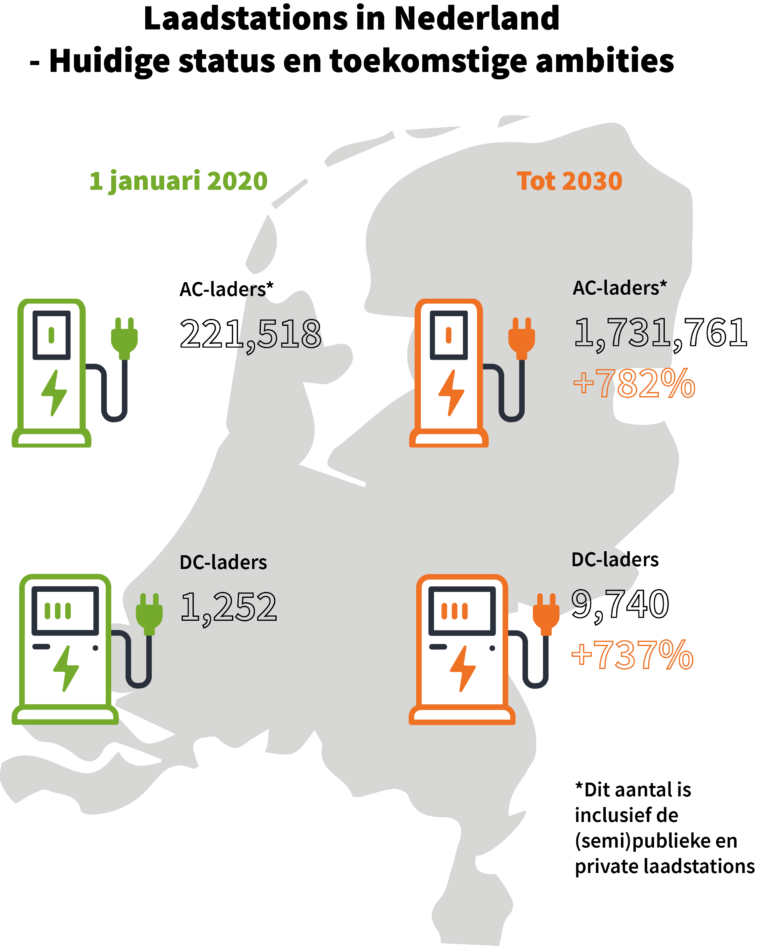 Om de laadinfrastructuur te laten aansluiten bij de ambities van de overheid is de “Nationale Agenda Laadinfrastructuur” in het leven geroepen. Tot 2030 verwacht de overheid 1,9 miljoen elektrische personenauto’s in het straatbeeld van Nederland. In de agenda is een prognose gemaakt van de oplaadpunten in de toekomst en een schatting van het benodigde aantal oplaadpunten. Men verwacht ongeveer 1,7 miljoen opladers nodig te hebben om de nodige elektriciteit voor de EV’s te leveren. Van deze 1,7 miljoen oplaadpunten zijn er ongeveer 10.000 snellaadstations. Dit betekent dat er tot 2030 gemiddeld 213 publieke laadpalen per werkdag geplaatst moeten worden om dit doel te bereiken (Rijksdienst voor Ondernemend Nederland, 2019)[10]. Om dit in perspectief te plaatsen: op 1 januari 2020 waren er 203.419 geregistreerde EV-personenauto’s, 49.520 (semi)publieke laadpunten en 1.252 snellaadpunten in Nederland (Nationale Agenda Laadinfrastructuur, 2020)[11].